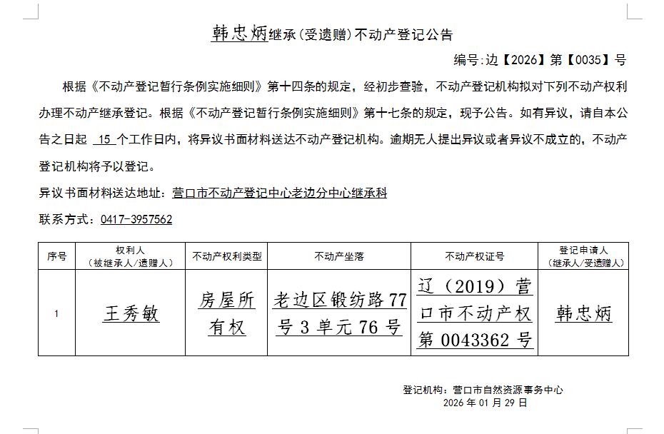 韓忠炳繼承(受遺贈)不動產(chǎn)登記公告