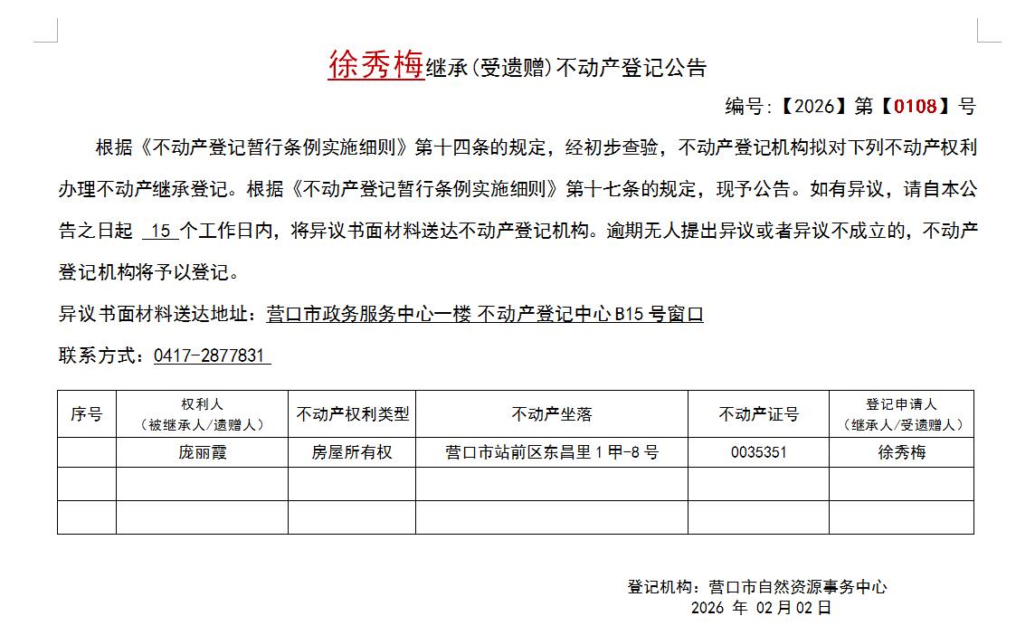 徐秀梅繼承(受遺贈)不動產(chǎn)登記公告