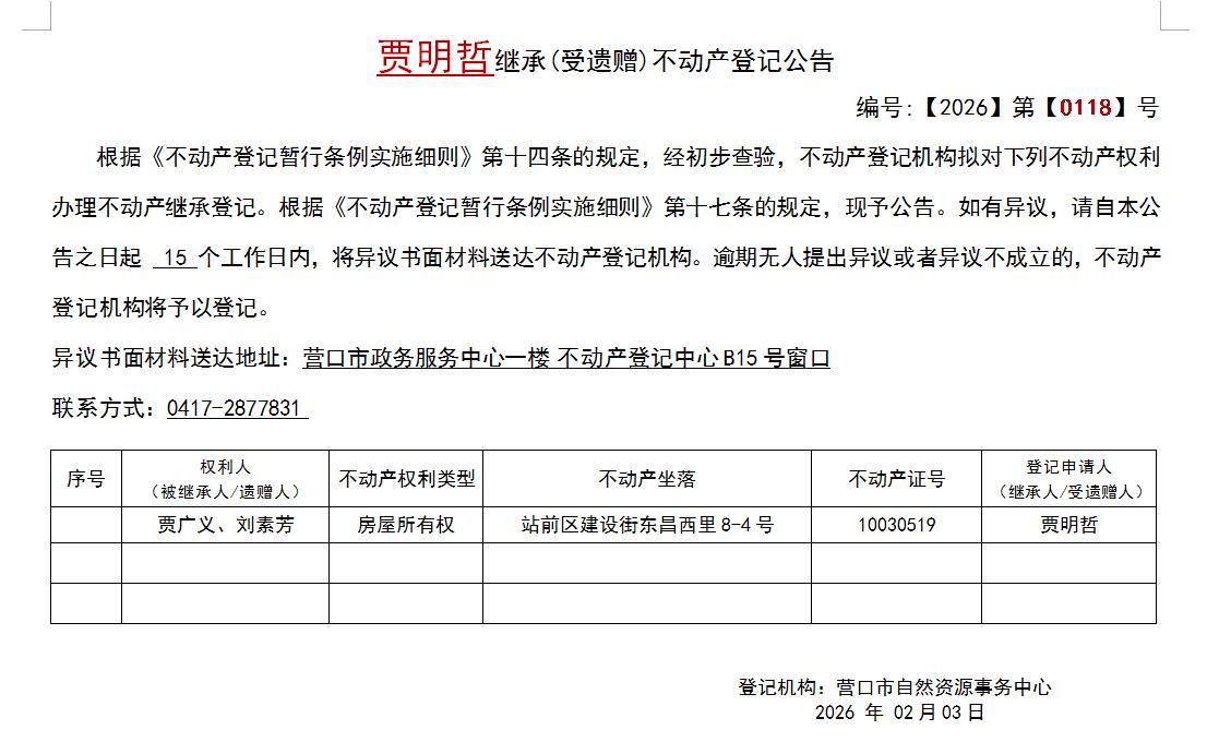 賈明哲繼承(受遺贈(zèng))不動(dòng)產(chǎn)登記公告