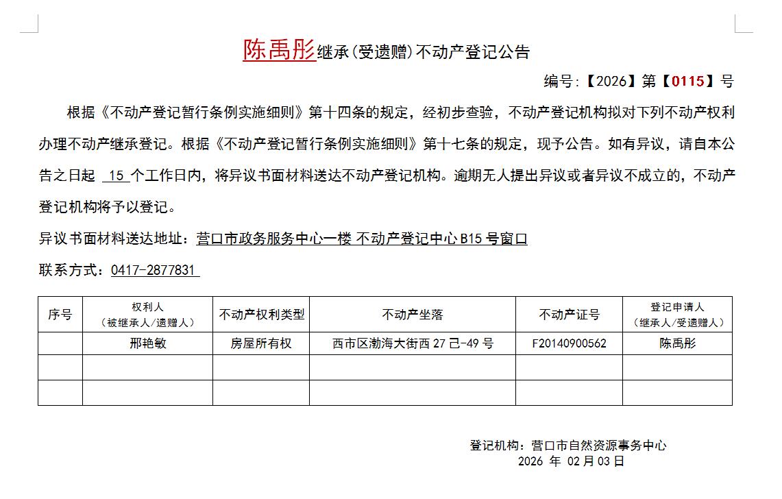 陳禹彤繼承(受遺贈(zèng))不動(dòng)產(chǎn)登記公告