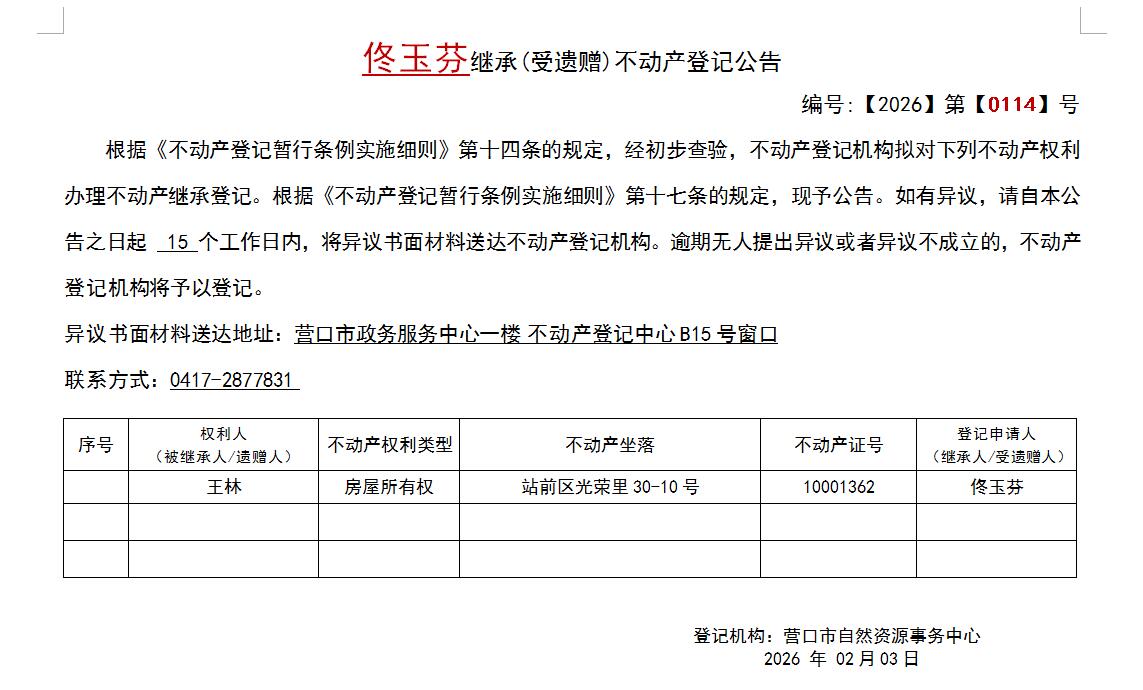 佟玉芬繼承(受遺贈)不動產(chǎn)登記公告