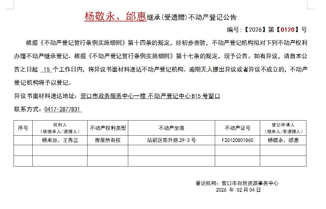 楊敬永、邰惠繼承(受遺贈(zèng))不動(dòng)產(chǎn)登記公告