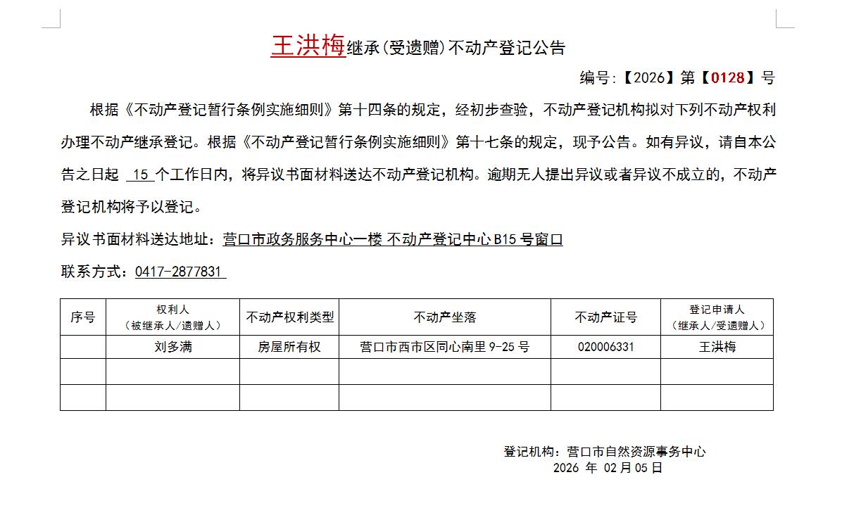 王洪梅繼承(受遺贈)不動產(chǎn)登記公告