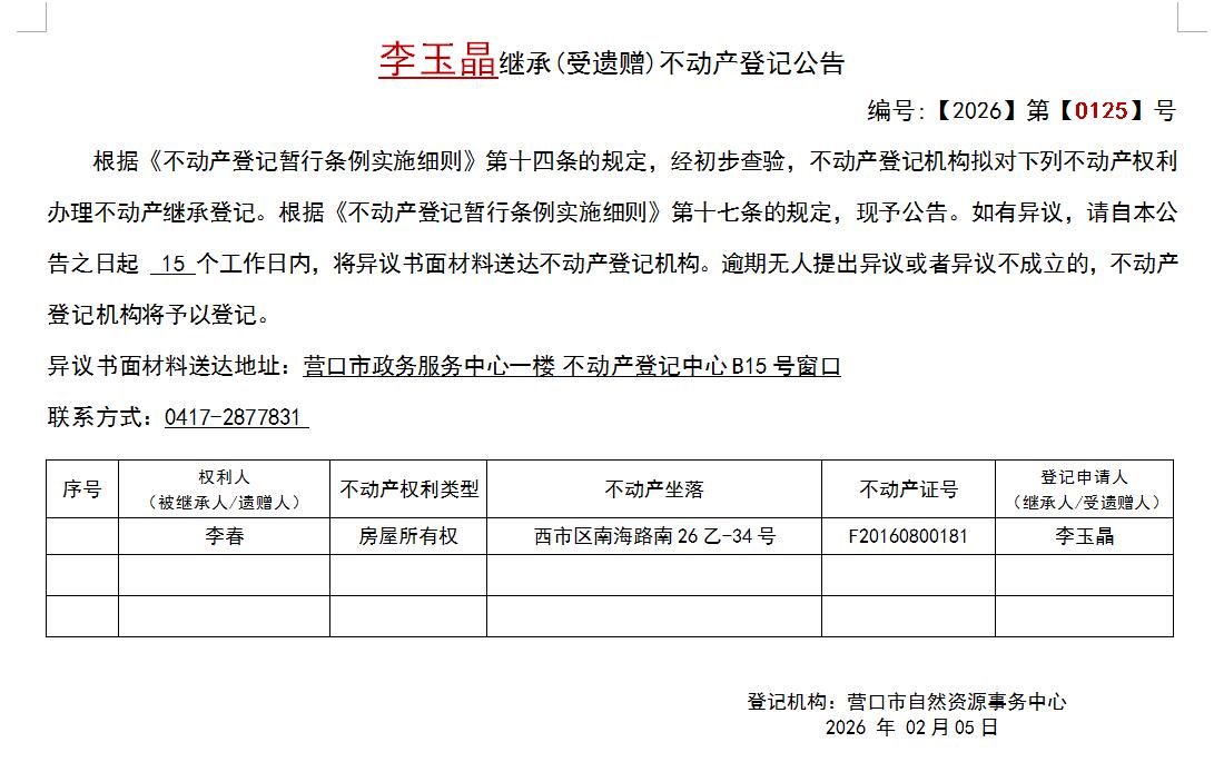 李玉晶繼承(受遺贈)不動產(chǎn)登記公告
