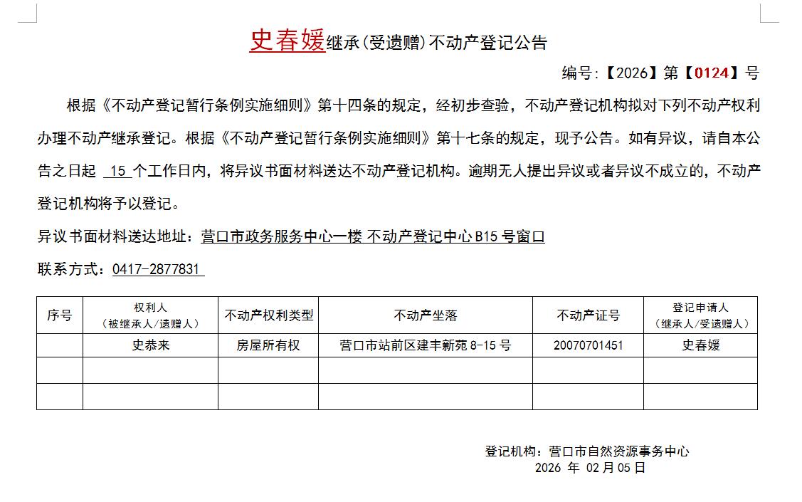 史春媛繼承(受遺贈)不動產(chǎn)登記公告