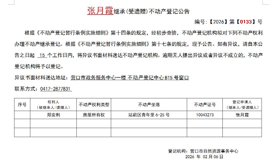 張月霞繼承(受遺贈)不動產(chǎn)登記公告