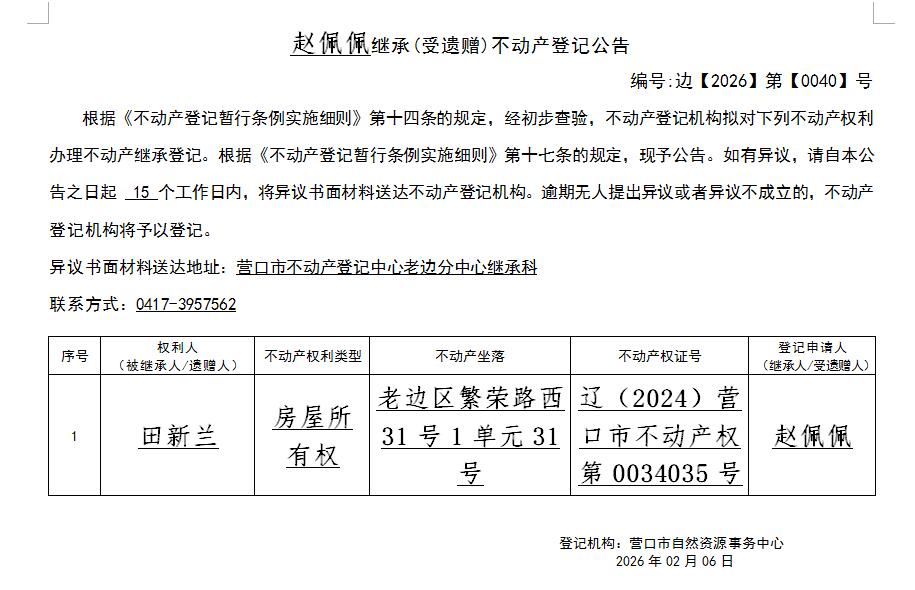 趙佩佩繼承(受遺贈(zèng))不動(dòng)產(chǎn)登記公告